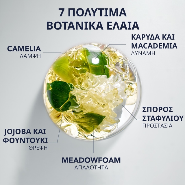 Ένα πραγματικό ελιξίριο θρέψης, αυτό το λάδι περιποίησης μετατρέπει τα ξηρά, ταλαιπωρημένα μαλλιά σε ελαστικά και μεταξένια μαλλιά. Η ελαφριά υφή του με ένα εθιστικό, σπινθηροβόλο άρωμα περιβάλλει και θρέφει τα μαλλιά χωρίς να τα βαραίνει. Μια σύνθεση πολλαπλών χρήσεων εμπλουτισμένη με 7 πολύτιμα βοτανικά έλαια: καμέλια, jojoba, φουντούκι, καρύδα, macadamia, σπόρους σταφυλιού και meadowfoam.